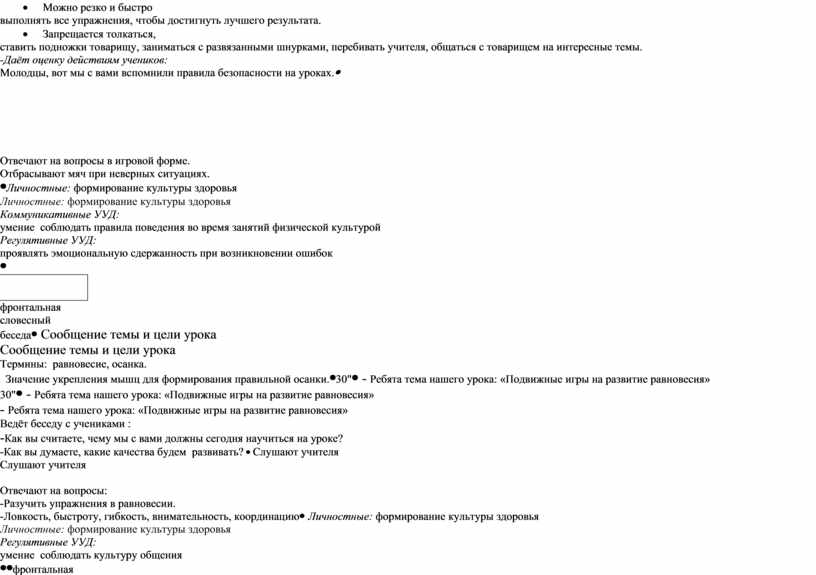 Познавательные УУД: умение демонстрировать выполнение упражнений на развитие равновесия Коммуникативные УУД: умение соблюдать правила поведения во время ПИ Регулятивные УУД: умение контролировать соответствие двигательных действий правилам подвижных игр Предметные: научатся играть в ПИ на развитие равновесия