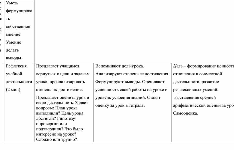 Предлагает учащимся вернуться к цели и задачам урока, проанализировать степень их достижения. Предлагает оценить урок и свою деятельность. Задает вопросы: План урока выполнили? Цель урока достигли? Гипотезу опровергли или подтвердили? Что было интересно на уроке? Сложно или трудно? |
