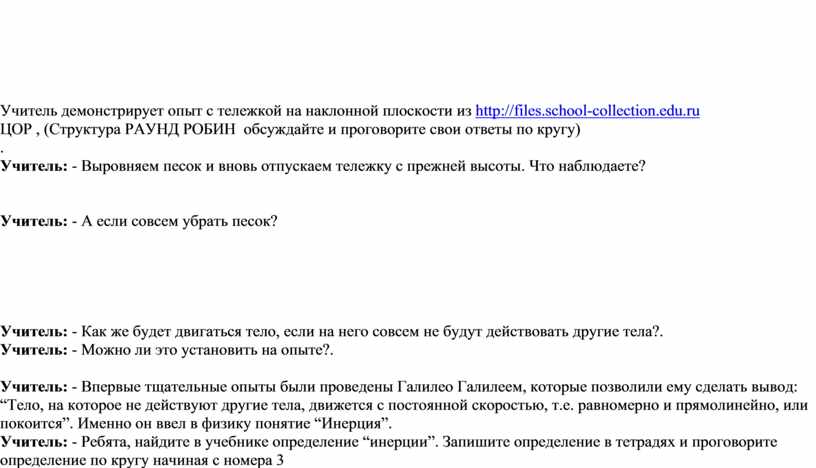 Учитель демонстрирует опыт с тележкой на наклонной плоскости из http://files.school-collection.edu.ru ЦОР , (Структура РАУНД РОБИН обсуждайте и проговорите свои ответы по кругу) .