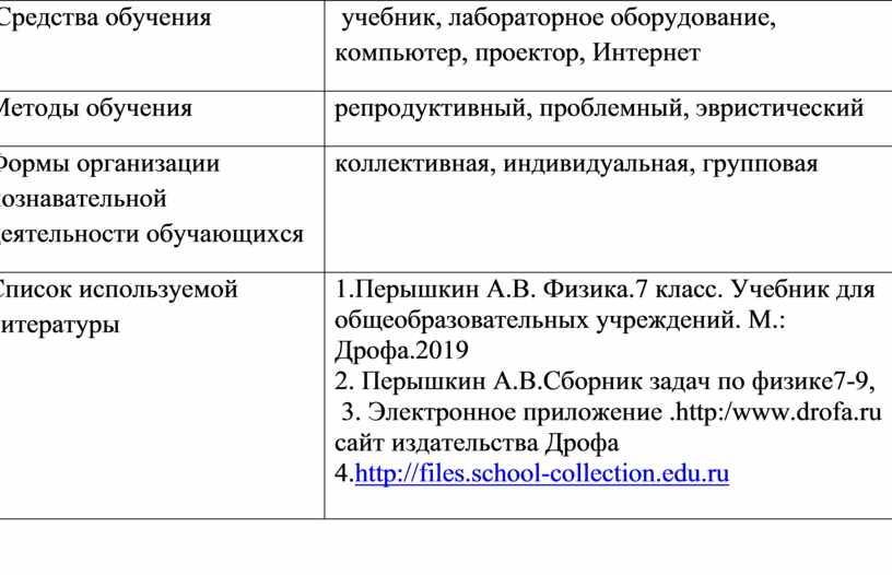1.Перышкин А.В. Физика.7 класс. Учебник для общеобразовательных учреждений. М.: Дрофа.2019 2. Перышкин А.В.Сборник задач по физике7-9, 3. Электронное приложение .http:/www.drofa.ru - сайт издательства Дрофа 4.http://files.school-collection.edu.ru