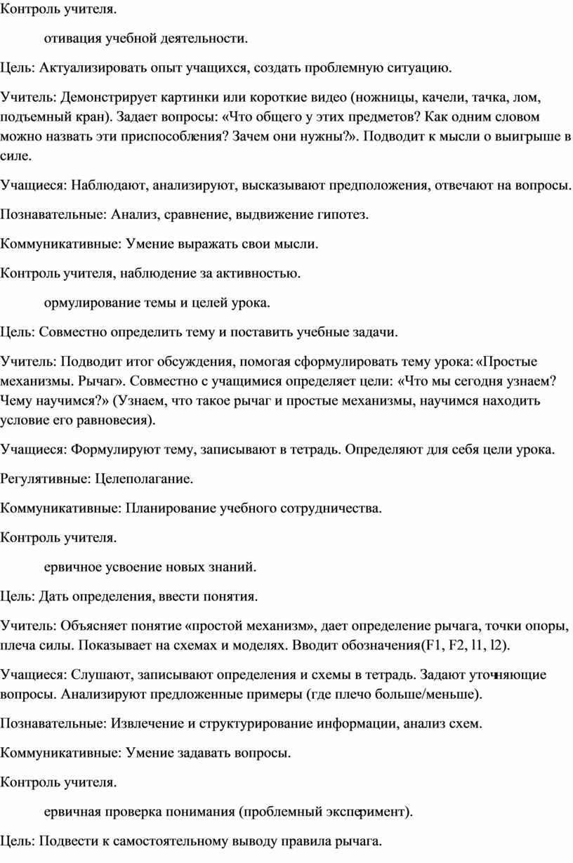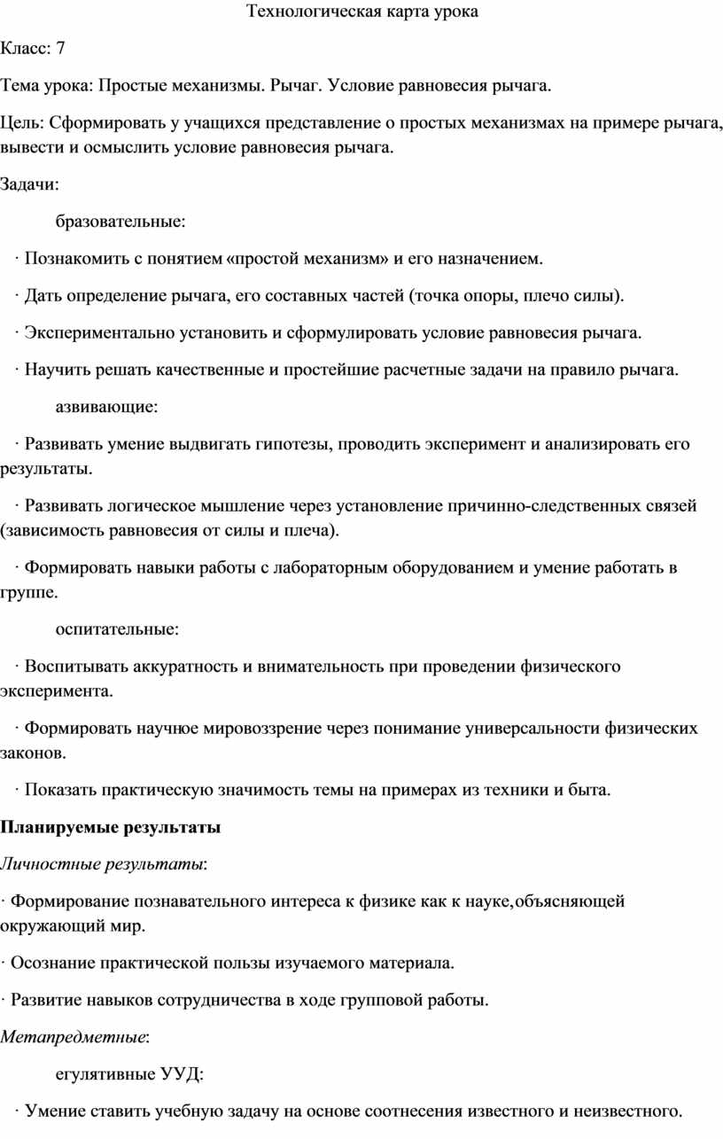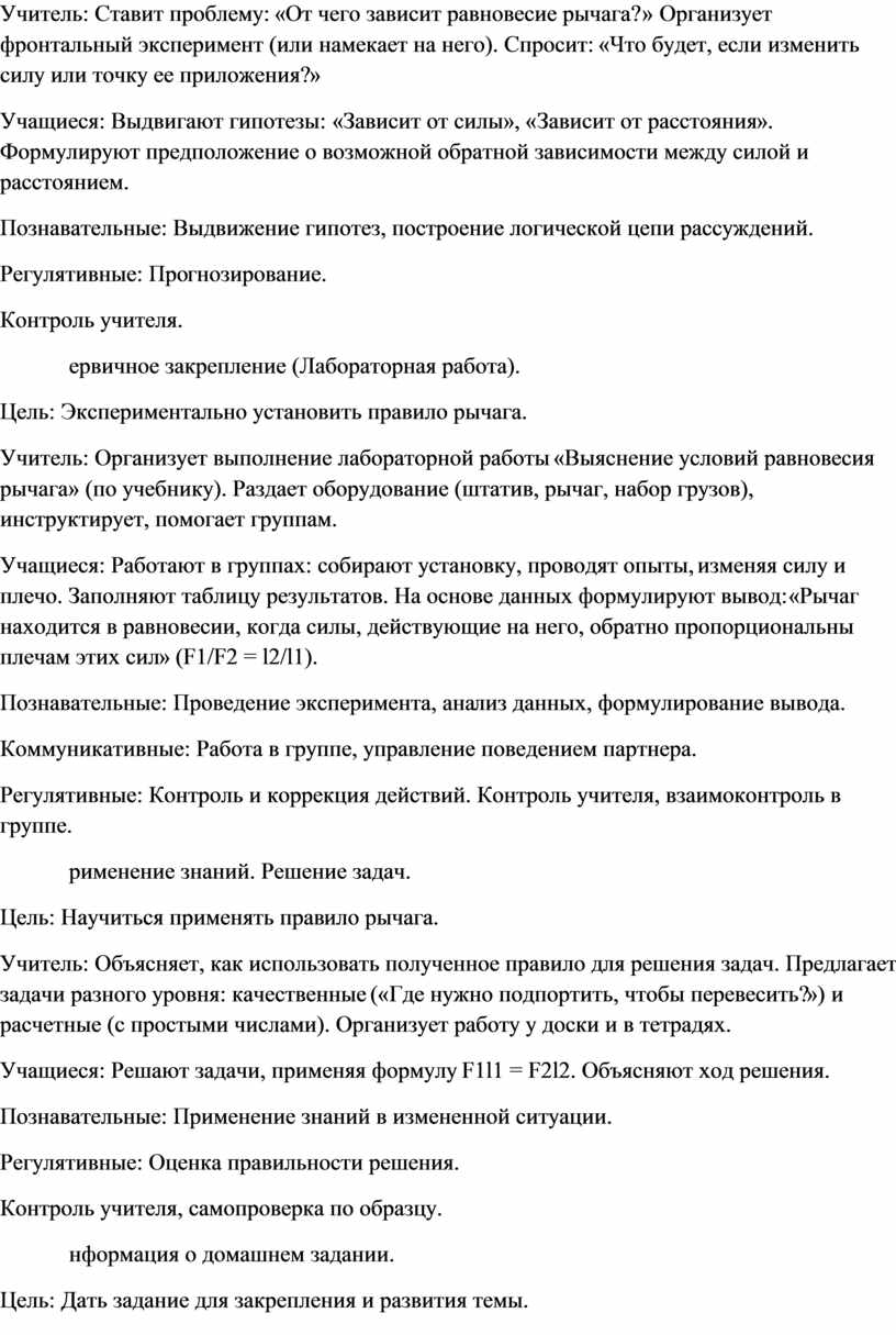 Учитель: Ставит проблему: «От чего зависит равновесие рычага?» Организует фронтальный эксперимент (или намекает на него). Спросит: «Что будет, если изменить силу или точку ее приложения?»