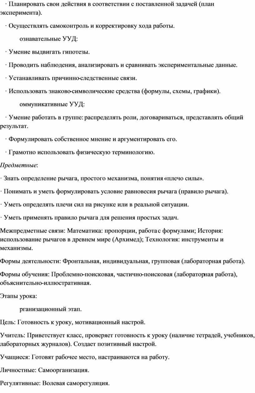 Межпредметные связи: Математика: пропорции, работа с формулами; История: использование рычагов в древнем мире (Архимед); Технология: инструменты и механизмы.