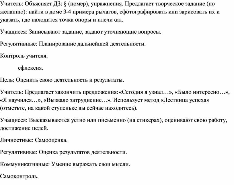 Учитель: Объясняет ДЗ: § (номер), упражнения. Предлагает творческое задание (по желанию): найти в доме 3-4 примера рычагов, сфотографировать или зарисовать их и указать, где находится точка опоры и плечи сил.