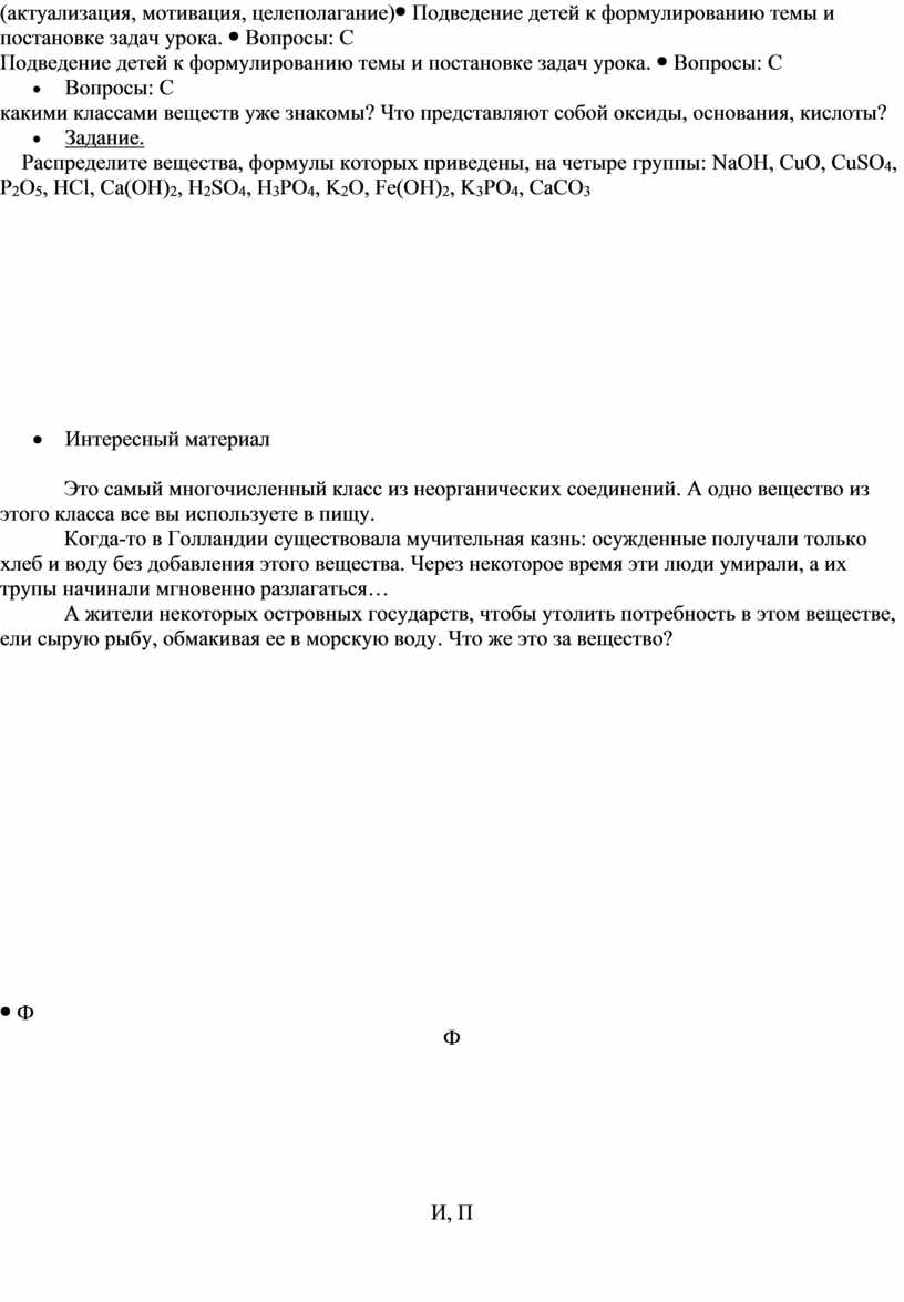 письменно в тетрадях формулы веществ по классам: оксиды, основания, кислоты, а в четвертой группе оказываются вещества, которые еще не изучали.