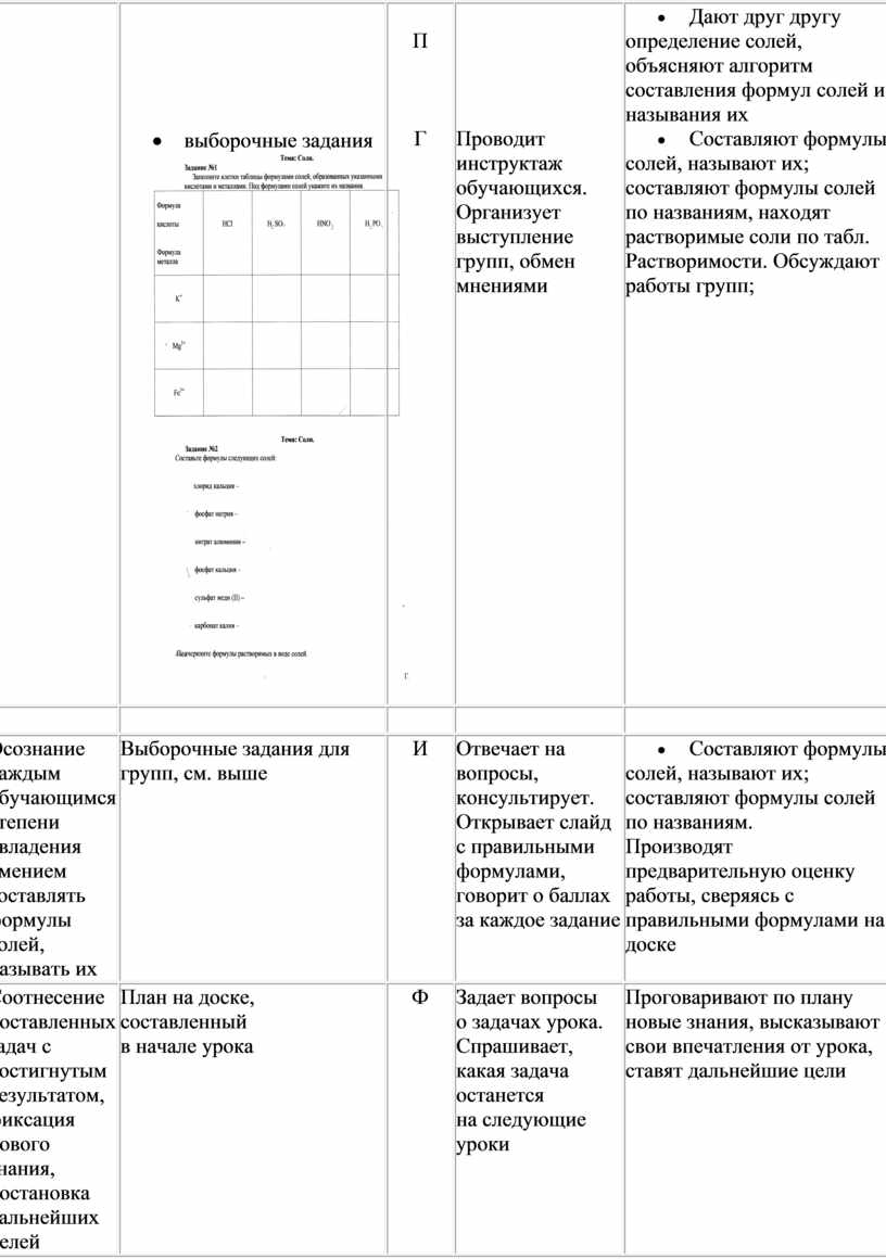 солей, называют их; составляют формулы солей по названиям, находят растворимые соли по табл. Растворимости. Обсуждают работы групп;