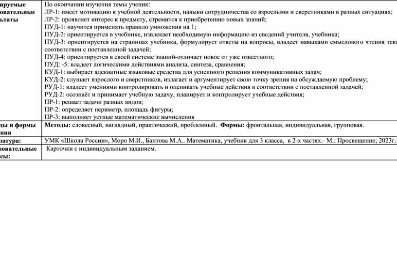По окончании изучения темы ученик: ЛР-1: имеет мотивацию к учебной деятельности, навыки сотрудничества со взрослыми и сверстниками в разных ситуациях; ЛР-2: проявляет интерес к предмету, стремится к приобретению новых знаний; ПУД-1: научится применять правило умножения на 1; ПУД-2: ориентируется в учебнике, извлекает необходимую информацию из сведений учителя, учебника; ПУД-3: ориентируется на страницах учебника, формулирует ответы на вопросы, владеет навыками смыслового чтения текста в соответствии с поставленной задачей; ПУД-4: ориентируется в своей системе знаний-отличает новое от уже известного; ПУД: -5: владеет логическими действиями анализа, синтеза, сравнения; КУД-1: выбирает адекватные языковые средства для успешного решения коммуникативных задач; КУД-2: слушает взрослого и сверстников, излагает и аргументирует свою точку зрения на обсуждаемую проблему; РУД-1: владеет умениями контролировать и оценивать учебные действия в соответствии с поставленной задачей; РУД-2: осознаёт и принимает учебную задачу, планирует и контролирует учебные действия; ПР-1: решает задачи разных видов; ПР-2: определяет периметр, площадь фигуры; ПР-3: выполняет устные математические вычисления |