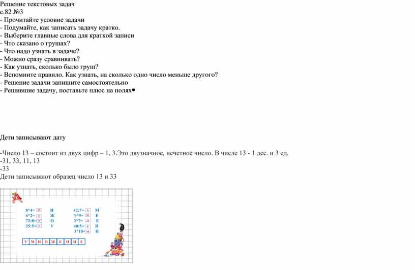 - Какую цель поставим перед собой на уроке? Работа с учебником. - Откройте учебник на с.82. Прочитайте правило в красной рамке. - Правильный ли вывод мы сделали? Первичное закрепление - Задание №1 выполните устно Практическая деятельность Решение текстовых задач с.82 №3 - Прочитайте условие задачи - Подумайте, как записать задачу кратко. - Выберите главные слова для краткой записи - Что сказано о грушах? - Что надо узнать в задаче? - Можно сразу сравнивать? - Как узнать, сколько было груш? - Вспомните правило. Как узнать, на сколько одно число меньше другого? - Решение задачи запишите самостоятельно - Решившие задачу, поставьте плюс на полях |