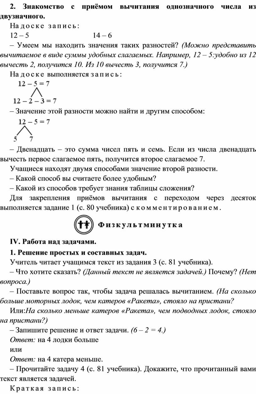 Педагогическая цель:создать условия для ознакомления с общим приёмом вычитания однозначного числа из двузначного с переходом через десяток; закрепления умений решать задачи и выражения изученных видов; развития навыков устного счёта.