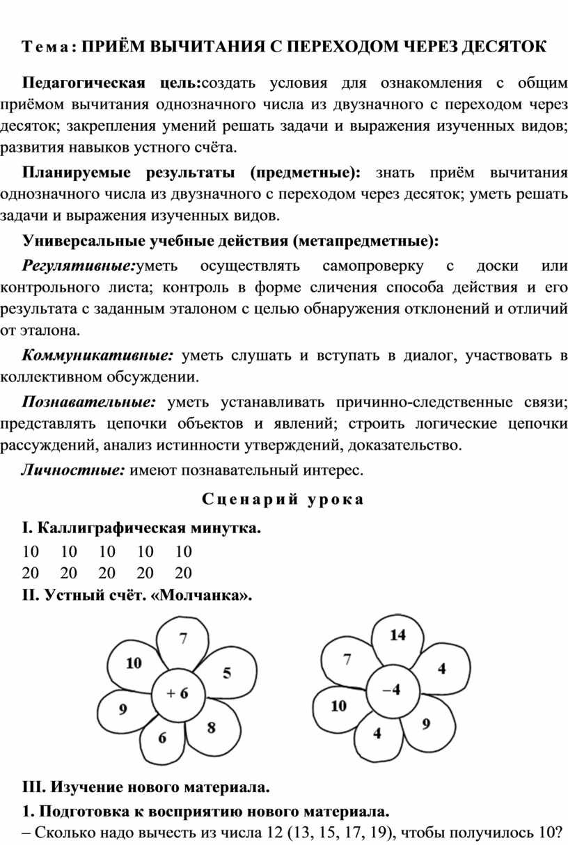 Планируемые результаты (предметные): знать приём вычитания однозначного числа из двузначного с переходом через десяток; уметь решать задачи и выражения изученных видов.