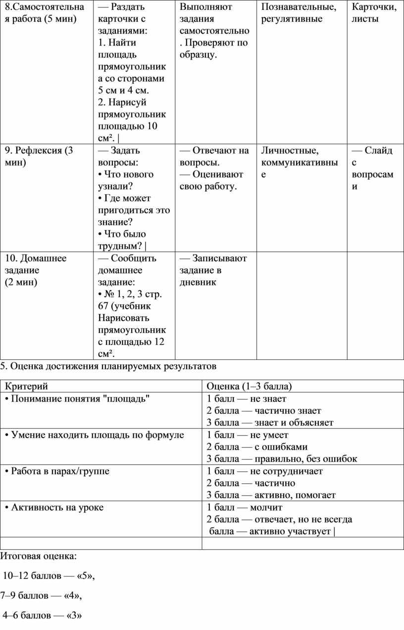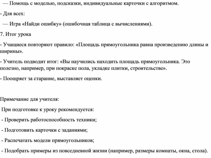 - Учитель подводит итог: «Вы научились находить площадь прямоугольника. Это полезно, например, при покраске пола, укладке плитки, строительстве».