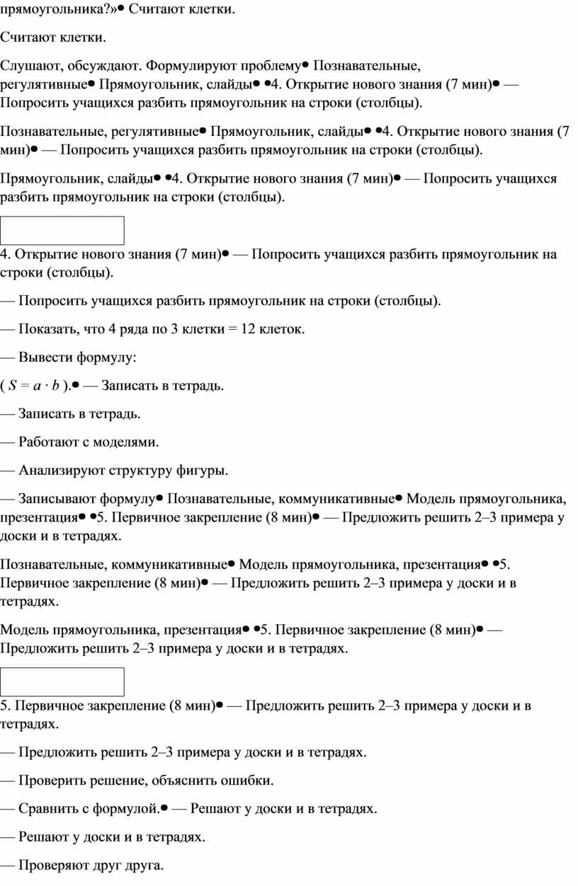 — Показать прямоугольник 4×3 см. — Спросить: «Сколько квадратных сантиметров в этом прямоугольнике?» — Подвести к выводу: «Нужно быстрее считать!» —Сформулировать проблему: «Как быстро найти площадь прямоугольника?» |