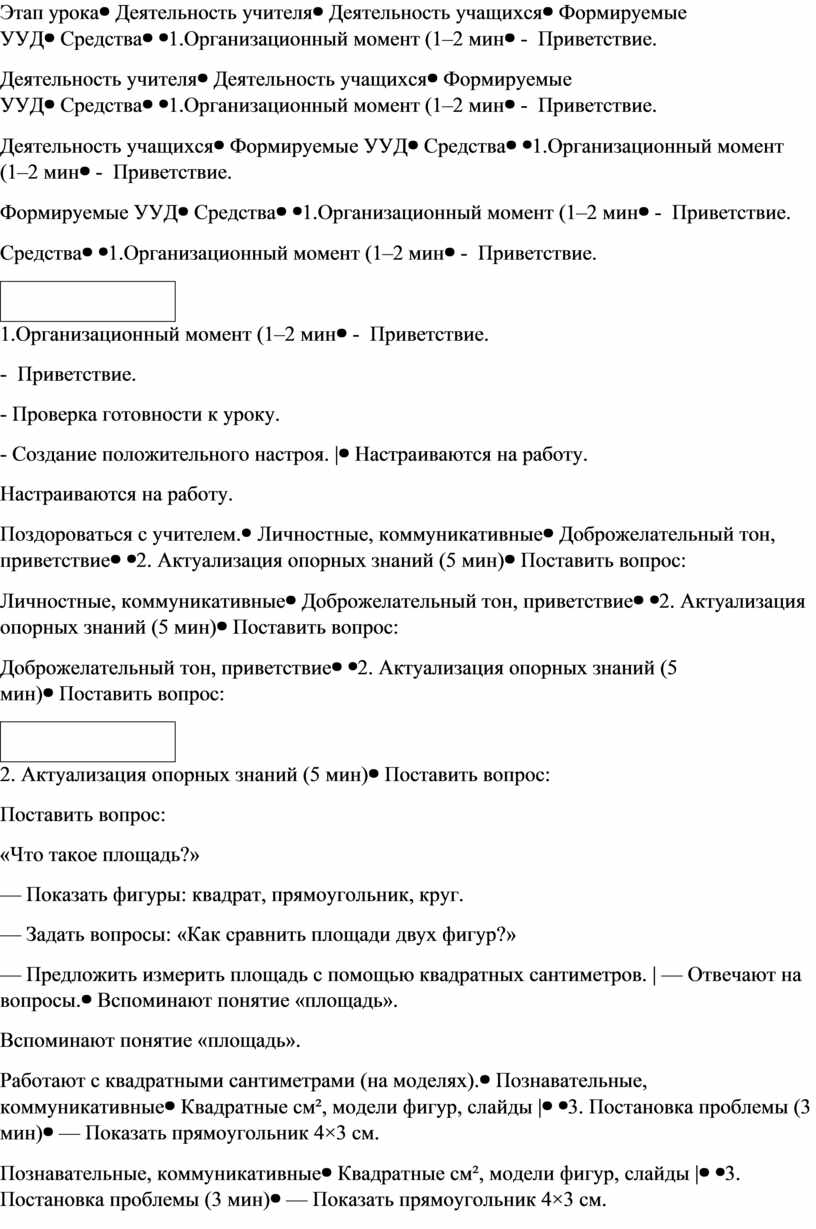 Поставить вопрос: «Что такое площадь?» — Показать фигуры: квадрат, прямоугольник, круг. — Задать вопросы: «Как сравнить площади двух фигур?» — Предложить измерить площадь с помощью квадратных сантиметров. | — Отвечают на вопросы. |