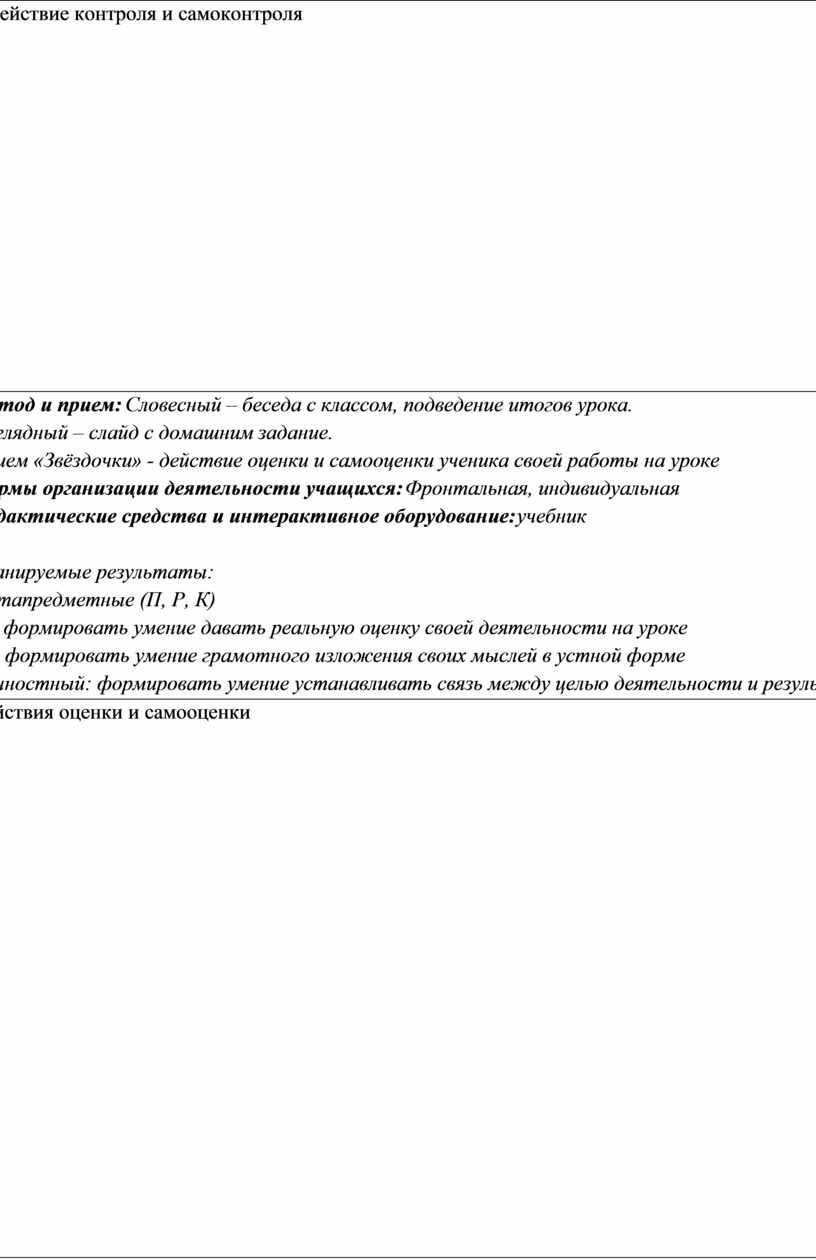 Метод и прием: Словесный – беседа с классом, подведение итогов урока. Наглядный – слайд с домашним задание. Прием «Звёздочки» - действие оценки и самооценки ученика своей работы на уроке Формы организации деятельности учащихся: Фронтальная, индивидуальная Дидактические средства и интерактивное оборудование: учебник