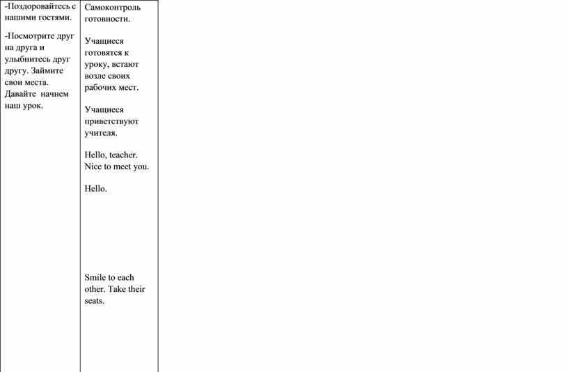Самоконтроль готовности. Учащиеся готовятся к уроку, встают возле своих рабочих мест. Учащиеся приветствуют учителя. Hello, teacher. Nice to meet you. Hello.