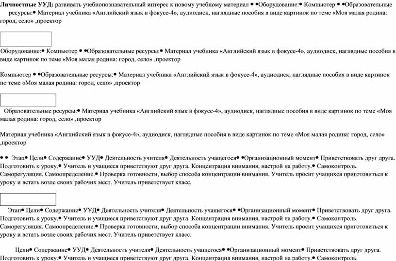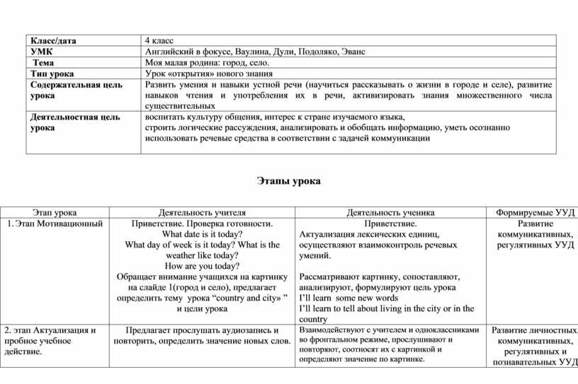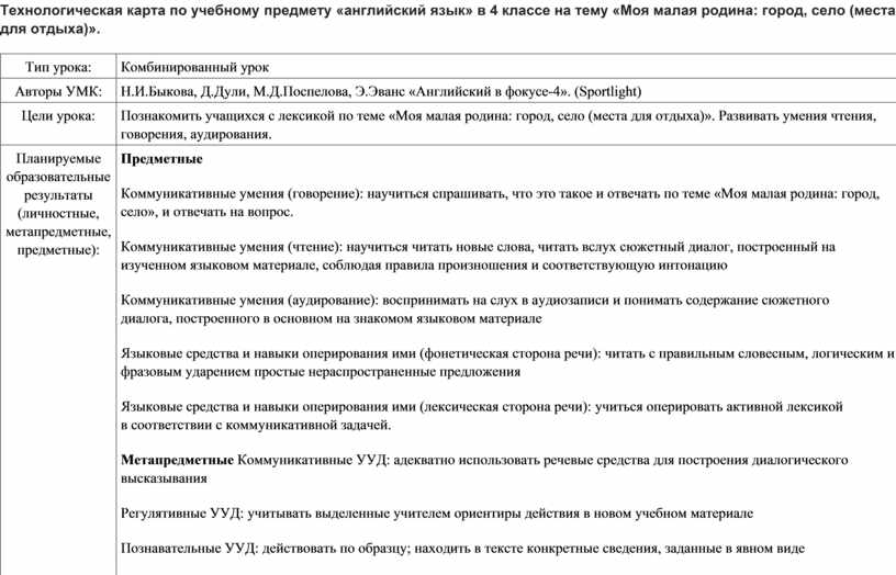 Технологическая карта по учебному предмету «английский язык» в 4 классе на тему «Моя малая родина: город, село (места для отдыха)».