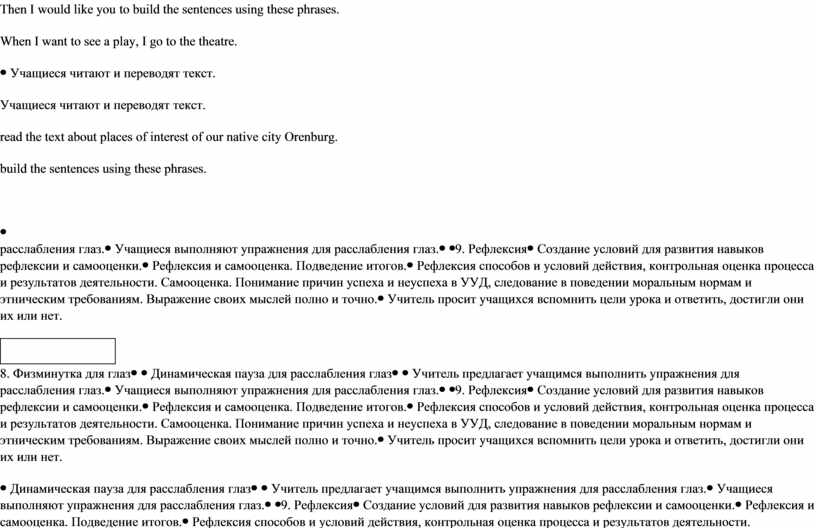 Учитель просит учащихся прочитать текст о достопримечательностях Оренбурга. Children, let’s read the text about places of interest of our native city Orenburg. Then I would like you to build the sentences using these phrases. When I want to see a play, I go to the theatre. |