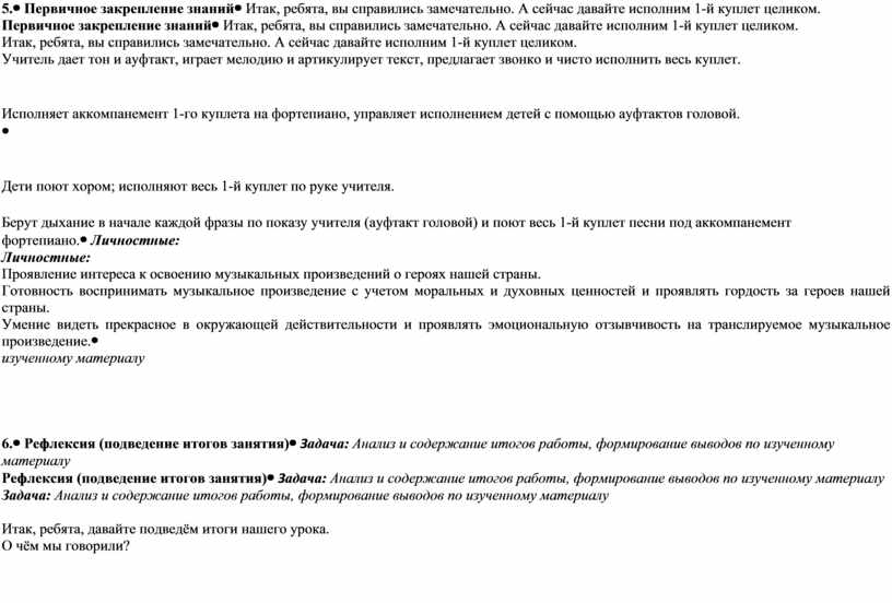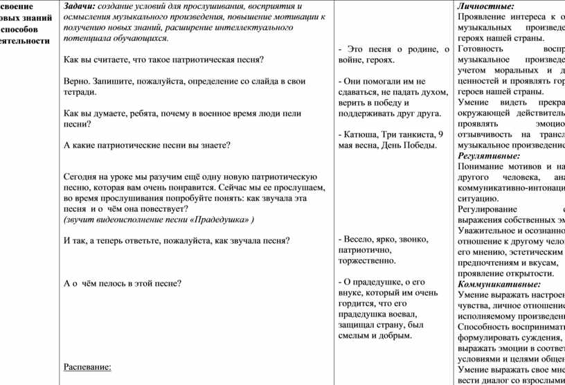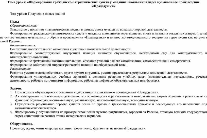 Формирование гражданско-патриотических чувств у младших школьников через единство слова и музыки в вокальных жанрах (песня) на основе анализа музыкального образа в произведении «Прадедушка» и личностно-эмоционального восприятия героя песни как патриота своей Родины.