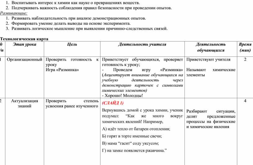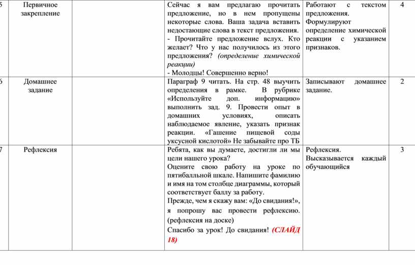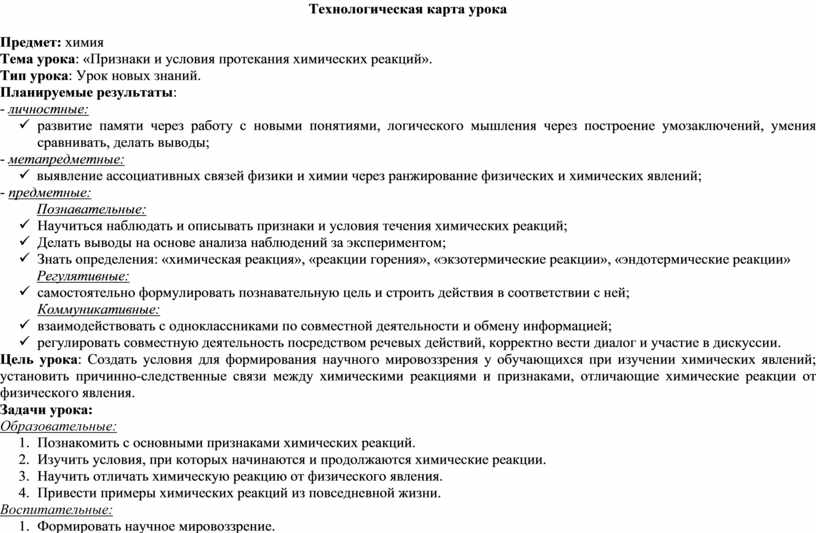 Технологическая карта урока на тему "Признаки химических реакций и условия их протекания"