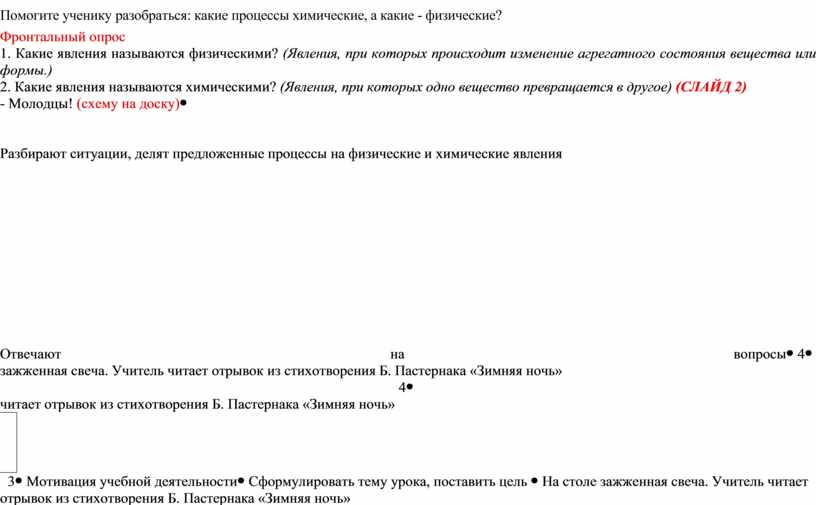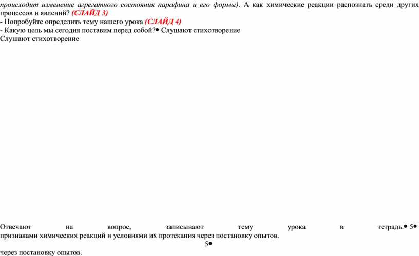 На столе зажженная свеча. Учитель читает отрывок из стихотворения Б. Пастернака «Зимняя ночь» Мело, мело по всей земле Во все пределы. Свеча горела на столе, Свеча горела. Как летом роем мошкара Летит на пламя, Слетались хлопья со двора К оконной раме. Метель лепила на стекле Кружки и стрелы. Свеча горела на столе, Свеча горела. - На прошлом уроке мы выяснили с вами, что горение свечи относится к физическому явлению, почему? (так как происходит изменение агрегатного состояния парафина и его формы). А как химические реакции распознать среди других процессов и явлений? (СЛАЙД 3) - Попробуйте определить тему нашего урока (СЛАЙД 4) - Какую цель мы сегодня поставим перед собой? |