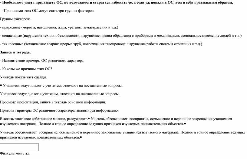 - В нашем доме, квартире могут произойти разные ОС. - Личная безопасность человека в повседневной жизни во многом зависит от него самого, от его умений соблюдать общепринятые правила безопасного поведения и верно реагировать на различные опасные и чрезвычайные ситуации, которые возникают в повседневной жизни. - А что нужно сделать для снижения (письм?) нежелательных последствий ОС или ЧС? - Необходимо уметь предвидеть ОС, по возможности стараться избежать ее, а если уж попали в ОС, вести себя правильным образом. Причинами этих ОС могут стать три группы факторов. Группы факторов: - природные (морозы, наводнения, жара, ураганы, землетрясения и т.д.) - социальные (нарушения техники безопасности, нарушение правил обращения с приборами и механизмами, асоциальное поведение людей и т.д.) - техногенные (технические аварии: прорыв труб, повреждения газопровода, нарушение работы системы отопления и т.д.) Запись в тетрадь. - Назовите еще примеры ОС различного характера. - Каковы же причины этих ОС? Учитель показывает слайды.