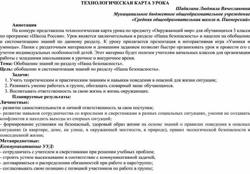 На конкурс представлена технологическая карта урока по предмету «Окружающий мир» для обучающихся 3 класса по программе «Школа России». Урок является заключительным в разделе «Наша безопасность» и нацелен на обобщение и систематизацию знаний по данному разделу. К уроку прилагается презентация и интерактивная игра «Умники и умницы». Папки с раздаточным материалом и домашним заданием позволят быстро организовать урок и провести его с учетом индивидуальных особенностей детей. Этот материал будет полезен учителям начальных классов для организации работы с младшими школьниками в урочное и внеурочное время.