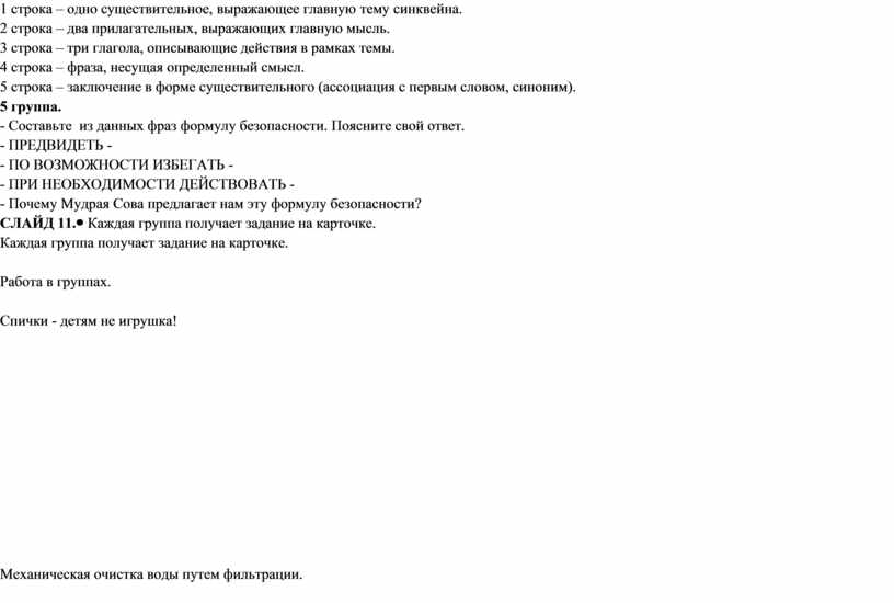 - Мудрая Сова приготовила разные задания для ваших групп. Карточки с заданиями. СЛАЙД 6. 1 группа. - Какое правило безопасности нарушат дети, если воспользуются вредным советом Г. Остера? СЛАЙД 7. Спички - лучшая игрушка Для скучающих детей. Папин галстук, машин паспорт - Вот и маленький костер. Если тапочки подкинуть Или веник подложить Можно целый стул зажарить, В тумбочке сварить уху. Если взрослые куда-то Спички спрятали от вас, Объясните им, что спички Для пожара вам нужны. 2 группа. Межпредметные связи (литературное чтение) СЛАЙД 8. «Черный ящик». Нет ни речки, ни пруда. Где воды напиться? Очень вкусная вода В ямке от копытца. - Как предметы из «Черного ящика» помогли бы сестрице Аленушке и братцу Иванушке избежать беды? Продемонстрируйте свой ответ. 3 группа. - Составьте из слов пословицу. Прочитайте. Объясните, почему так говорят? СЛАЙД 9. Берегись бед, пока их нет! 4 группа. Межпредметные связи (русский язык) - Составьте синквейн на тему «Наша безопасность». СЛАЙД 10. Алгоритм. 1 строка – одно существительное, выражающее главную тему cинквейна. 2 строка – два прилагательных, выражающих главную мысль. 3 строка – три глагола, описывающие действия в рамках темы. 4 строка – фраза, несущая определенный смысл. 5 строка – заключение в форме существительного (ассоциация с первым словом, синоним). 5 группа. - Составьте из данных фраз формулу безопасности. Поясните свой ответ. - ПРЕДВИДЕТЬ - - ПО ВОЗМОЖНОСТИ ИЗБЕГАТЬ - - ПРИ НЕОБХОДИМОСТИ ДЕЙСТВОВАТЬ - - Почему Мудрая Сова предлагает нам эту формулу безопасности? СЛАЙД 11. |