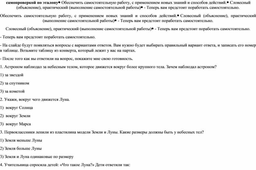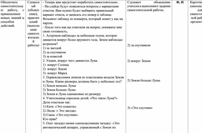 - Теперь вам предстоит поработать самостоятельно. - На слайде будут появляться вопросы с вариантами ответов. Вам нужно будет выбирать правильный вариант ответа, и записать его номер в таблице. Возьмите таблицу из конверта, который лежит у вас на партах. - После того как вы ответили на вопрос, покажите мне свою готовность. 1. Астроном наблюдал за небесным телом, которое движется вокруг более крупного тела. Зачем наблюдал астроном? 1) за звездой 2) за спутником 3) за кометой 2. Укажи, вокруг чего движется Луна. 1) вокруг Солнца 2) вокруг Земли 3) вокруг Марса 3. Первоклассники лепили из пластилина модели Земли и Луны. Какие размеры должны быть у небесных тел? 1) Земля меньше Луны 2) Земля больше Луны 3) Земля и Луна одинаковые по размеру 4. Учительница спросила детей: «Что такое Луна?» Дети ответили так: 1) Катя: «Это планета». 2) Люда: « Это звезда». 3) Саша: «Это спутник». Кто прав? 5. Олег загадал своим одноклассникам загадку: «Это автоматический аппарат, управляемый с Земли по радио, который посылали на Луну». Выбери ответ к загадке. 1) ракета 2) самолет 3) луноход - Проверим то, что у вас получилось, для этого обменяйтесь таблицами с соседом по парте и сравните ответы с ответами, представленными на слайде. Исправьте ошибки, если вы их допустили. - Оцените свою работу. Если вы без ошибок справились с этим заданием или допустили одну ошибку, то поднимите зеленую ладошку. Если вы допустили больше одной ошибки, то поднимите красную ладошку. |