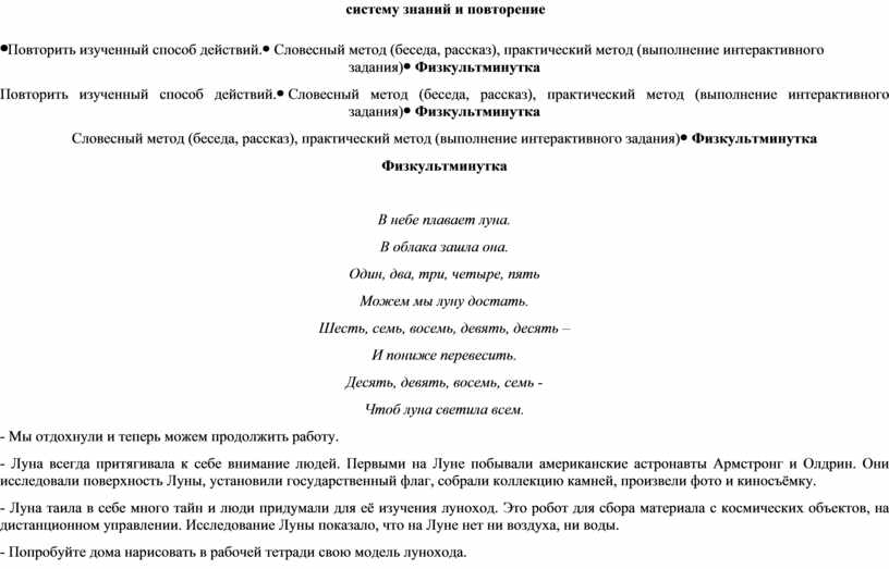 В небе плавает луна. В облака зашла она. Один, два, три, четыре, пять Можем мы луну достать. Шесть, семь, восемь, девять, десять – И пониже перевесить. Десять, девять, восемь, семь - Чтоб луна светила всем. - Мы отдохнули и теперь можем продолжить работу. - Луна всегда притягивала к себе внимание людей. Первыми на Луне побывали американские астронавты Армстронг и Олдрин. Они исследовали поверхность Луны, установили государственный флаг, собрали коллекцию камней, произвели фото и киносъёмку. - Луна таила в себе много тайн и люди придумали для её изучения луноход. Это робот для сбора материала с космических объектов, на дистанционном управлении. Исследование Луны показало, что на Луне нет ни воздуха, ни воды. - Попробуйте дома нарисовать в рабочей тетради свою модель лунохода. - Также Луну изучают с помощью телескопа, прибора, который увеличивает изображение в несколько раз. С помощью него на Луне были найдены лунные моря и горы. - Для того чтобы узнать, насколько внимательно вы меня слушали, предлагаю вам найти кто и с помощью чего изучают Луну. (Приложение 5) - Вы правильно нашли все слова, пришло время переходить к следующему заданию. |