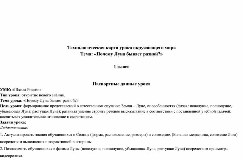 Цель урока: формирование представлений о естественном спутнике Земли – Луне, ее особенностях (фазах: новолуние, полнолуние, убывающая Луна, растущая Луна); развивая умение строить речевое высказывание в соответствии с поставленной учебной задачей; воспитывая уважительное отношение к сверстникам.