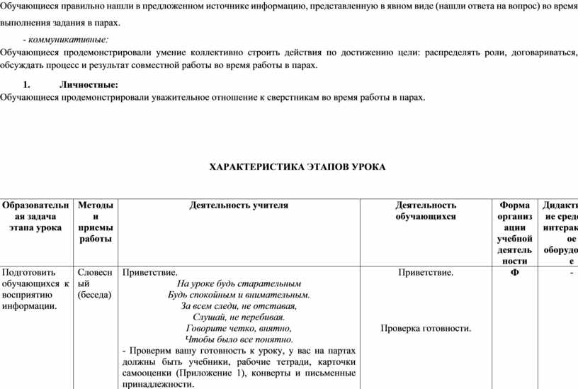 ХАРАКТЕРИСТИКА ЭТАПОВ УРОКА