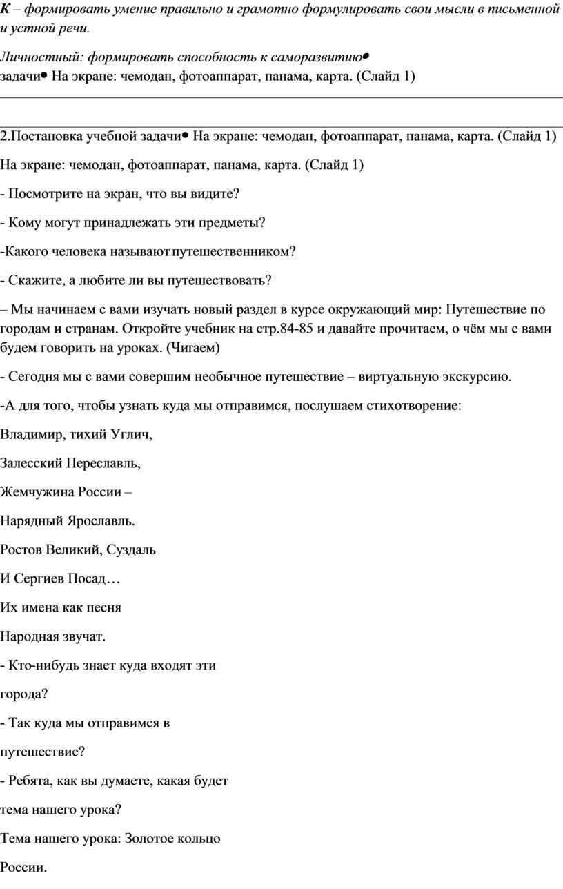 На экране: чемодан, фотоаппарат, панама, карта. (Слайд 1) - Посмотрите на экран, что вы видите? - Кому могут принадлежать эти предметы? -Какого человека называют путешественником? - Скажите, а любите ли вы путешествовать? – Мы начинаем с вами изучать новый раздел в курсе окружающий мир: Путешествие по городам и странам. Откройте учебник на стр.84-85 и давайте прочитаем, о чём мы с вами будем говорить на уроках. (Читаем) - Сегодня мы с вами совершим необычное путешествие – виртуальную экскурсию. -А для того, чтобы узнать куда мы отправимся, послушаем стихотворение: Владимир, тихий Углич, Залесский Переславль, Жемчужина России – Нарядный Ярославль. Ростов Великий, Суздаль И Сергиев Посад… Их имена как песня Народная звучат. - Кто-нибудь знает куда входят эти города? - Так куда мы отправимся в путешествие? - Ребята, как вы думаете, какая будет тема нашего урока? Тема нашего урока: Золотое кольцо России. - Каковы же цели нашего путешествия? - Верно. Сегодня мы должны решить следующие задачи: 1. Выяснить, что такое Золотое Кольцо? 2. Какие богатства оно в себе скрывает? 3. Почему в названии употребляются слова «кольцо» и «золотое»? - Ещё раз обратите своё внимание на тему нашего занятия. Может быть у вас появились вопросы? (Почему кольцо? Почему Золотое?) -Может быть, у кого-то из вас есть какие-то предположения, варианты ответов? (Ответы детей.) Тогда мы с вами можем выдвинуть гипотезы (предположения): – Кольцо, так как наш путь будет напоминать кольцо. – Золотое, так эти города являются достоянием нашего государства, в них много памятников истории, архитектуры, искусства, а в конце урока увидим оказались ли наши гипотезы верными. – Готовы? Тогда в путь! Руки на месте, ноги вместе, локти у края, спина прямая. (Напоминание о правильной осанке во время урока.) |