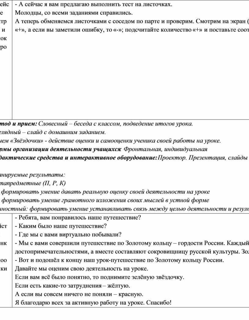 Метод и прием: Словесный – обсуждение достопримечательностей Золотого кольца России. Наглядный – задание на листочках. Прием «Взаимопроверка» - учащиеся обмениваются листочками и проверяют ответы друг друга Формы организации деятельности учащихся: Фронтальная, групповая, индивидуальная Дидактические средства и интерактивное оборудование: Презентация