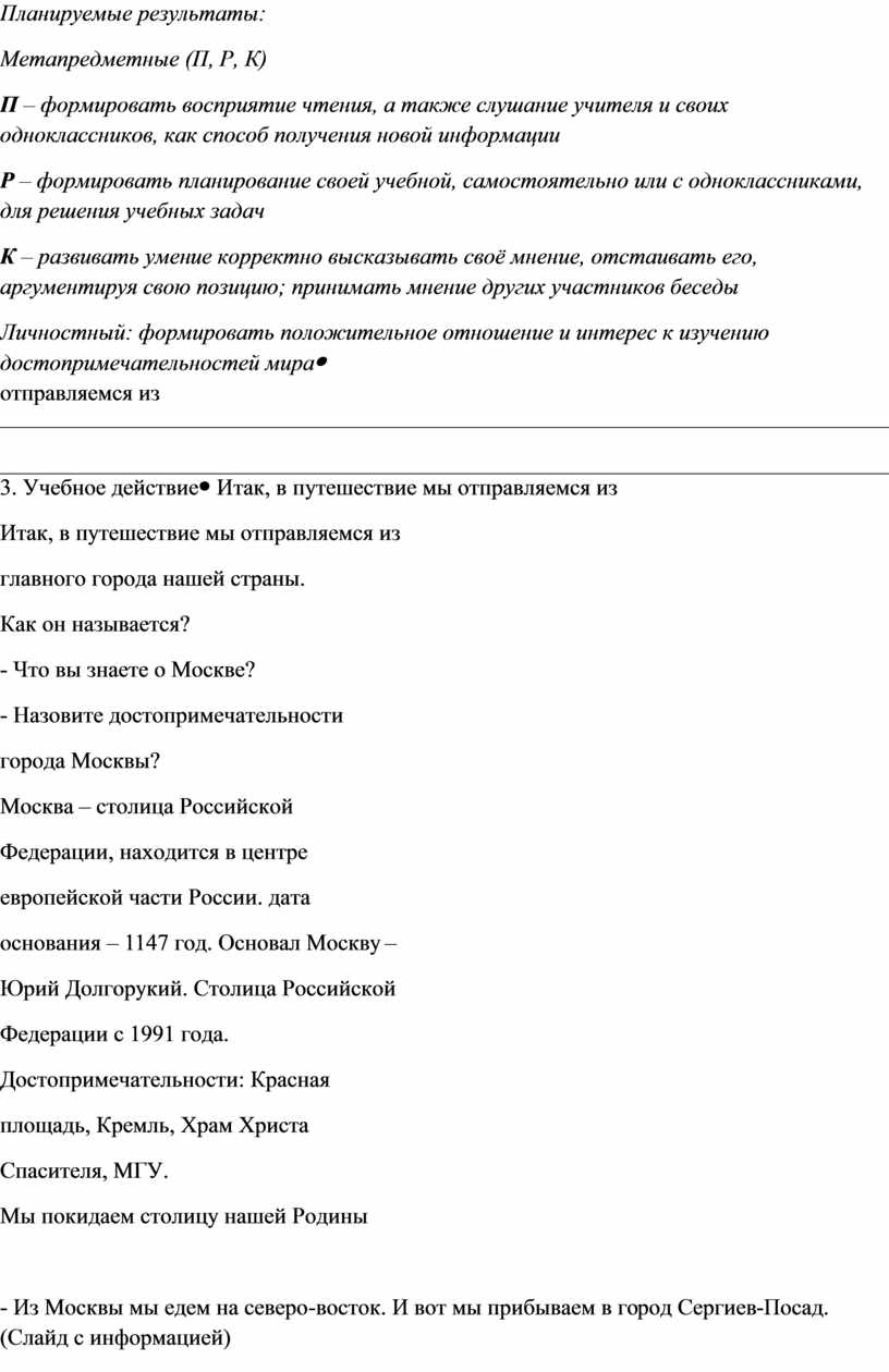 Планируемые результаты: Метапредметные (П, Р, К) П – формировать восприятие чтения, а также слушание учителя и своих одноклассников, как способ получения новой информации Р – формировать планирование своей учебной, самостоятельно или с одноклассниками, для решения учебных задач К – развивать умение корректно высказывать своё мнение, отстаивать его, аргументируя свою позицию; принимать мнение других участников беседы Личностный: формировать положительное отношение и интерес к изучению достопримечательностей мира |