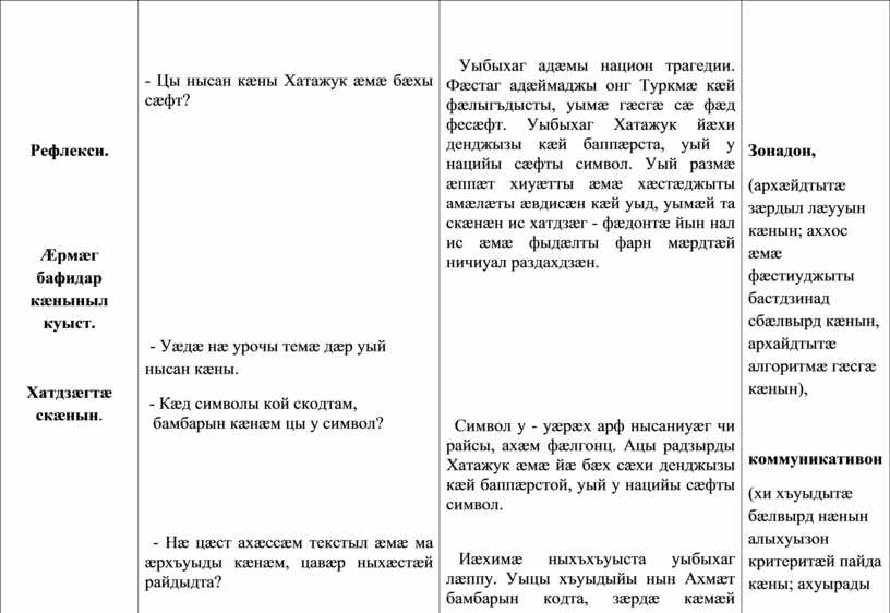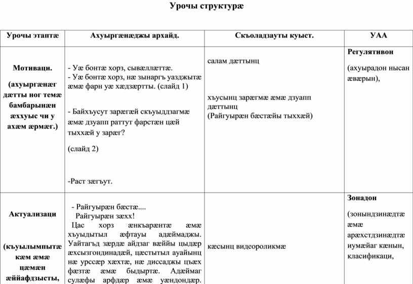 Предметон: текстæн йæ сæйраг хъуыды сбæрæг кæнын, анализ скæнын. Метапредметон: уацмысы персонажты архайд, сæ ныхасæн аргъ кæнын. Удгоймагон: лæгдзинады æууæлтыл æрдзурын, удыхъæды хорз миниуджытæ рæзын кæнын. |