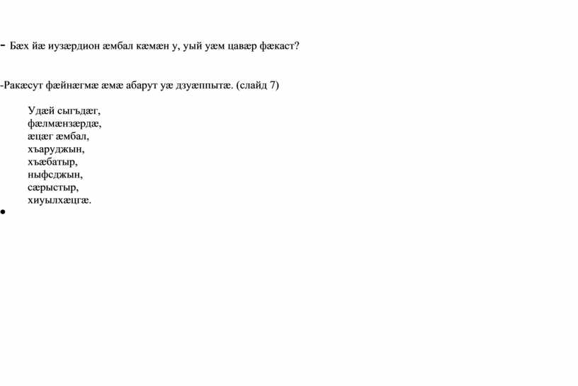 -Ракæсут фæйнæгмæ æмæ абарут уæ дзуæппытæ. (слайд 7)