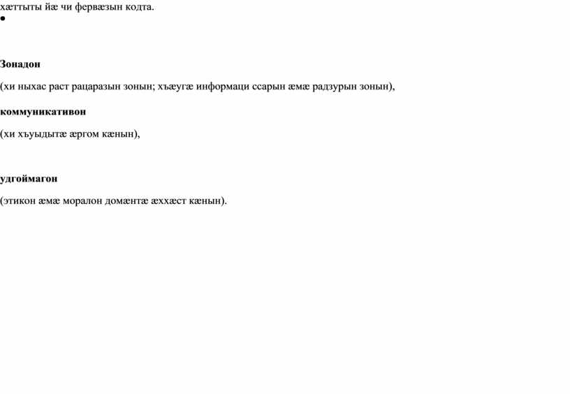 коммуникативон (бæлвырд æмæ биноныг дзурын хи хъуыдытæ; иумæйаг уынаффæмæ æрцæуын иумæйаг хъуыддаг аразгæйæ)