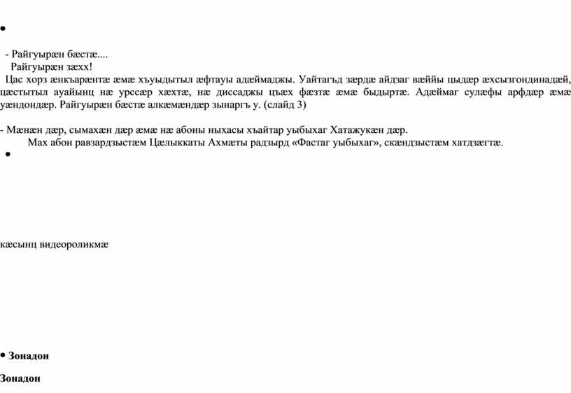 - Райгуырæн бæстæ.... Райгуырæн зæхх! Цас хорз æнкъарæнтæ æмæ хъуыдытыл æфтауы адæймаджы. Уайтагъд зæрдæ айдзаг вæййы цыдæр æхсызгондинадæй, цæстытыл ауайынц нæ урссæр хæхтæ, нæ диссаджы цъæх фæзтæ æмæ быдыртæ. Адæймаг сулæфы арфдæр æмæ уæндондæр. Райгуырæн бæстæ алкæмæндæр зынаргъ у. (слайд 3)
