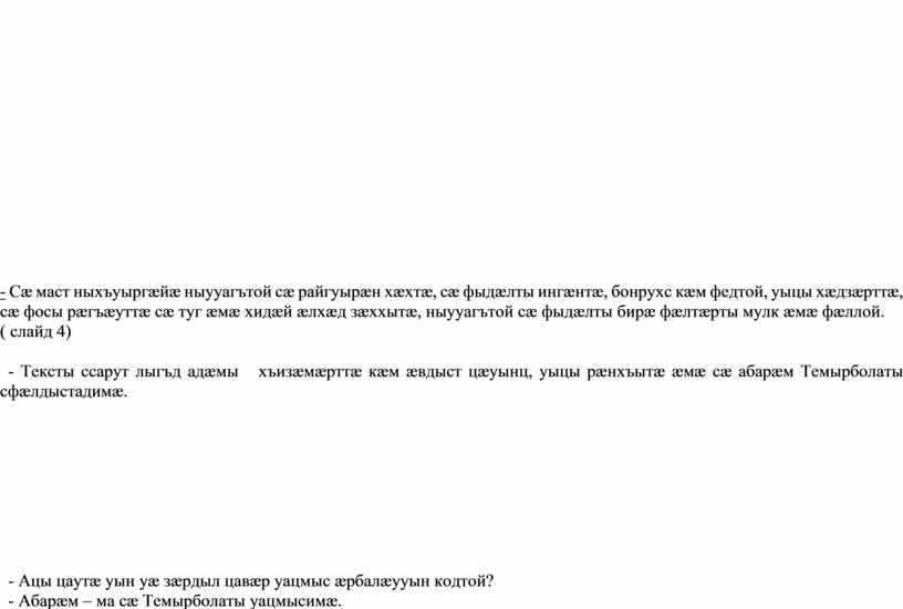- Ацы цаутæ уын уæ зæрдыл цавæр уацмыс æрбалæууын кодтой? - Абарæм – ма сæ Темырболаты уацмысимæ. - Кæсы æмдзæвгæйæ скъуыддзаг. (слайд 5)