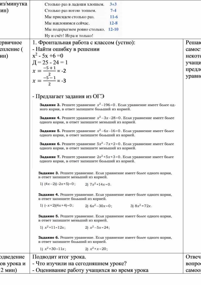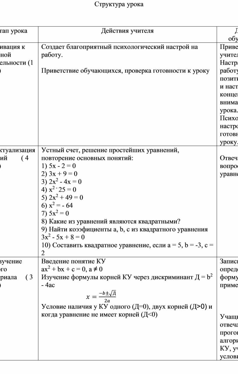 Технологическая карта урока по теме «Решение квадратных уравнений»