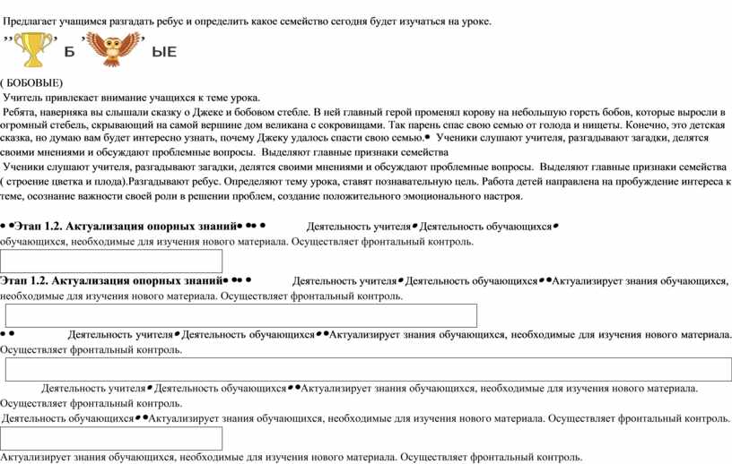 Ученики слушают учителя, разгадывают загадки, делятся своими мнениями и обсуждают проблемные вопросы. Выделяют главные признаки семейства ( строение цветка и плода).Разгадывают ребус. Определяют тему урока, ставят познавательную цель. Работа детей направлена на пробуждение интереса к теме, осознание важности своей роли в решении проблем, создание положительного эмоционального настроя.