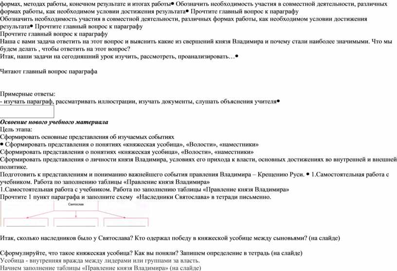 1.Самостоятельная работа с учебником. Работа по заполнению таблицы «Правление князя Владимира» Прочтите 1 пункт параграфа и заполните схему «Наследники Святослава» в тетради письменно.