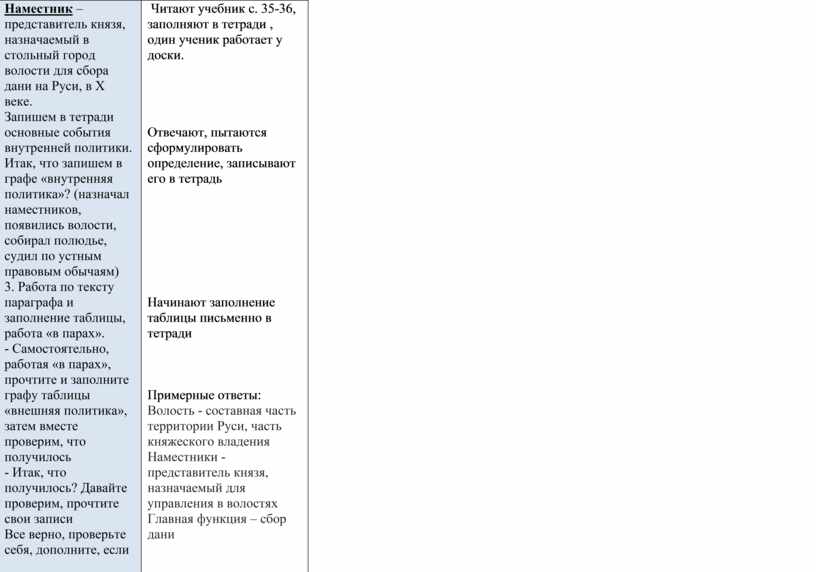 Запишите имя князя, назовите и запишите годы его правления 2. Комментированное чтение и беседа по прочитанному Давайте прочтем п.2 параграфа вместе, «по цепочке». Что такое «волости»? Кто такие «наместники»? Какую функцию они выполняли? Кто напомнит, что такое «полюдье», «погосты»? Кто их ввел? Запишем определения в тетради (на слайде) Волость – крупная территориальная единица на Руси в X веке со стольным городом, управлявшаяся представителем из рода Рюриковичей. Наместник – представитель князя, назначаемый в стольный город волости для сбора дани на Руси, в X веке. Запишем в тетради основные события внутренней политики. Итак, что запишем в графе «внутренняя политика»? (назначал наместников, появились волости, собирал полюдье, судил по устным правовым обычаям) 3. Работа по тексту параграфа и заполнение таблицы, работа «в парах». - Самостоятельно, работая «в парах», прочтите и заполните графу таблицы «внешняя политика», затем вместе проверим, что получилось - Итак, что получилось? Давайте проверим, прочтите свои записи Все верно, проверьте себя, дополните, если кто-то что-то не записал (слайд)