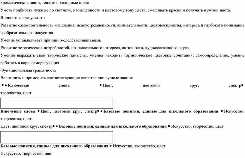 Предметные умения Познакомить с понятием «цвет», «спектр», «цветовой круг» Закрепить понятие основные и составные цвета, ахроматические и хроматические цвета, теплые и холодные цвета Уметь подбирать нужные по светлоте, насыщенности и цветовому тону цвета, смешивать краски и получать нужные цвета. Личностные результаты Развитие самостоятельности мышления, целеустремленности, внимательности, цветовосприятия, интереса и глубокого понимания изобразительного искусства. Умение устанавливать причинно-следственные связи. Развитие эстетических потребностей, познавательного интереса, активности, художественного вкуса Умения выражать свои творческие замыслы, умения находить гармонические цветовые сочетания; самоопределение, умение работать в паре, саморегуляция Функциональная грамотность Вспомнить и применить соответствующие естественнонаучные знания