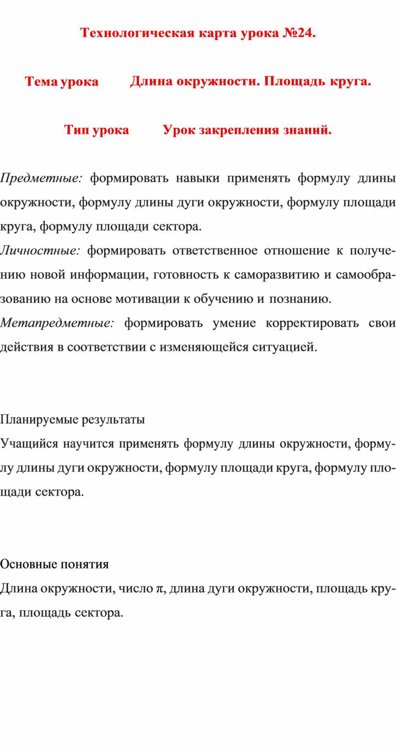 Предметные: формировать навыки применять формулу длины окружности, формулу длины дуги окружности, формулу площади круга, формулу площади сектора.