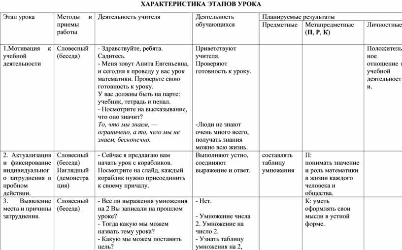 ХАРАКТЕРИСТИКА ЭТАПОВ УРОКА