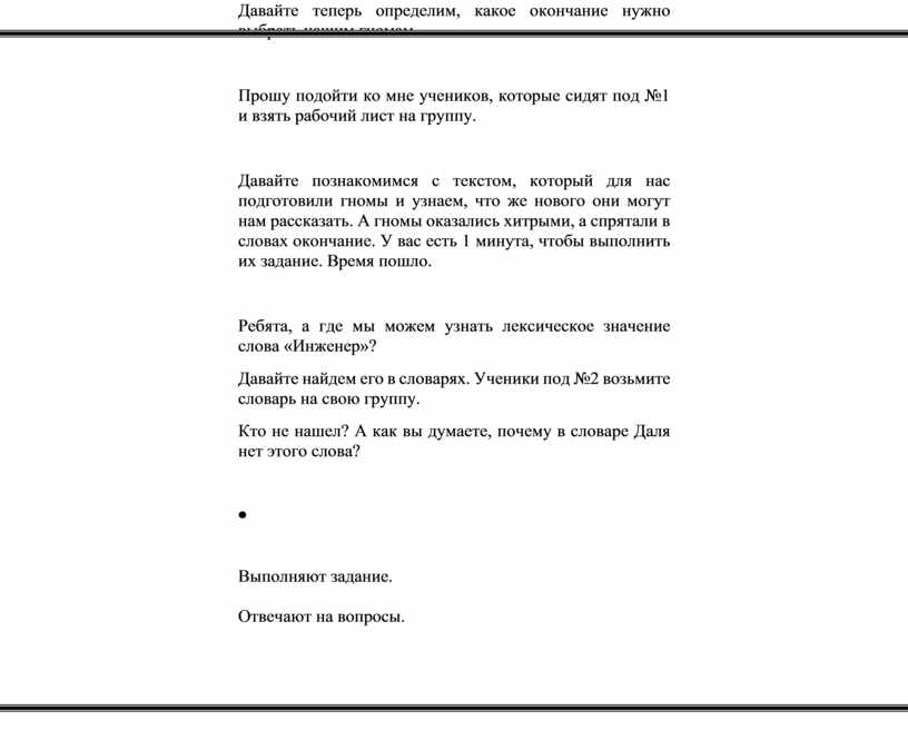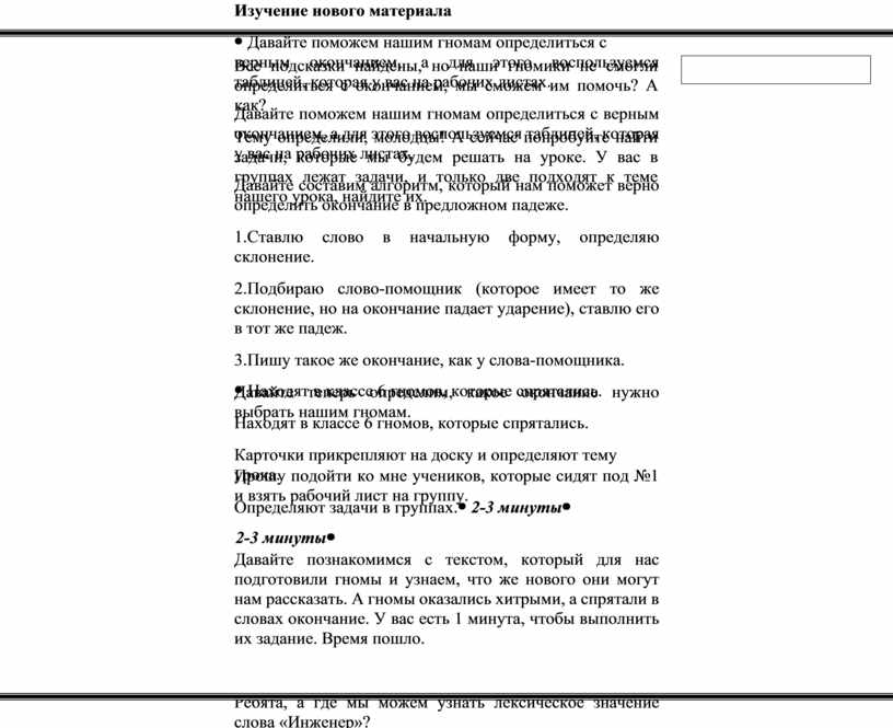 Давайте познакомимся с текстом, который для нас подготовили гномы и узнаем, что же нового они могут нам рассказать. А гномы оказались хитрыми, а спрятали в словах окончание. У вас есть 1 минута, чтобы выполнить их задание. Время пошло.