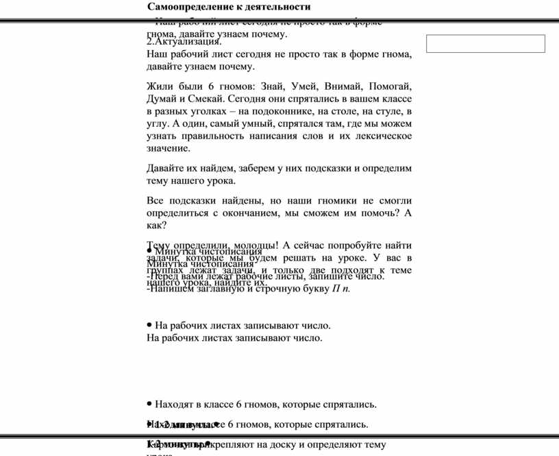 Наш рабочий лист сегодня не просто так в форме гнома, давайте узнаем почему. Жили были 6 гномов: Знай, Умей, Внимай, Помогай, Думай и Смекай. Сегодня они спрятались в вашем классе в разных уголках – на подоконнике, на столе, на стуле, в углу. А один, самый умный, спрятался там, где мы можем узнать правильность написания слов и их лексическое значение. Давайте их найдем, заберем у них подсказки и определим тему нашего урока. Все подсказки найдены, но наши гномики не смогли определиться с окончанием, мы сможем им помочь? А как? Тему определили, молодцы! А сейчас попробуйте найти задачи, которые мы будем решать на уроке. У вас в группах лежат задачи, и только две подходят к теме нашего урока, найдите их.