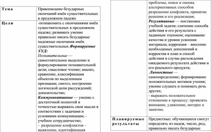 -познакомить с окончаниями имён существительных в предложном падеже; развивать умение правильно писать безударные падежные окончания имён существительных.Формируемые УУД: Познавательные — самостоятельное выделение и формулирование познавательной цели; смысловое чтение; анализ, сравнение, классификация объектов по выделенным признакам; синтез; построение логической цепи рассуждений; доказательство; Коммуникативные — умение с достаточной полнотой и точностью выражать свои мысли в соответствии с задачами и условиями коммуникации; - учебное сотрудничество; - разрешение конфликтов – выявление, идентификация проблемы, поиск и оценка альтернативных способов разрешение конфликта, принятие решения и его реализация; Регулятивные — постановка учебной задачи; сличение способа действия и его результата с заданным эталоном; оценивание качества и уровня усвоения материала; коррекция – внесение необходимых дополнений и корректив в план и способ действия в случае расхождения ожидаемого результата действия и его реального продукта; Личностные — самоопределение; формирование положительных мотивов учения; умение слушать и понимать речь других; - выражать положительное отношение к процессу: проявлять внимание, удивление, интерес к занятию.