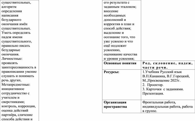 Предметные: обучающиеся смогут определять из падеж, число, род, правильно писать безударные окончания имён существительных. Знать: склонение имен существительных, алгоритм определения написания безударного окончания имён существительных. Уметь определять падеж имени существительного, правильно писать безударные окончания. Личностные: проявлять заинтересованность в правописании умение слушать и понимать речь других. Метапредметные: инициативное сотрудничество с учителем и сверстниками; контроль, коррекция, оценка действий партнёра, сличение способа действия и его результата с заданным эталоном; внесение необходимых дополнений и корректив в план и способ действия; выделение и осознание того, что уже усвоено и что ещё подлежит усвоению, оценивание качества и уровня усвоения; |