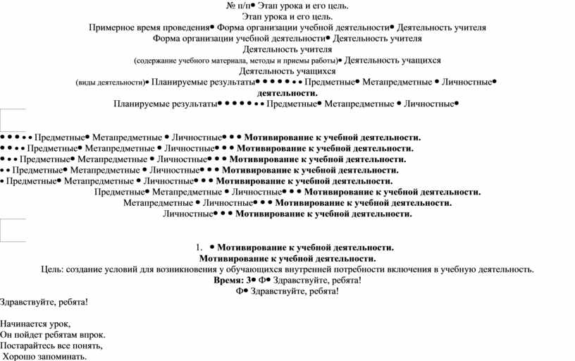 Мотивирование к учебной деятельности. Цель: создание условий для возникновения у обучающихся внутренней потребности включения в учебную деятельность. Время: 3 |